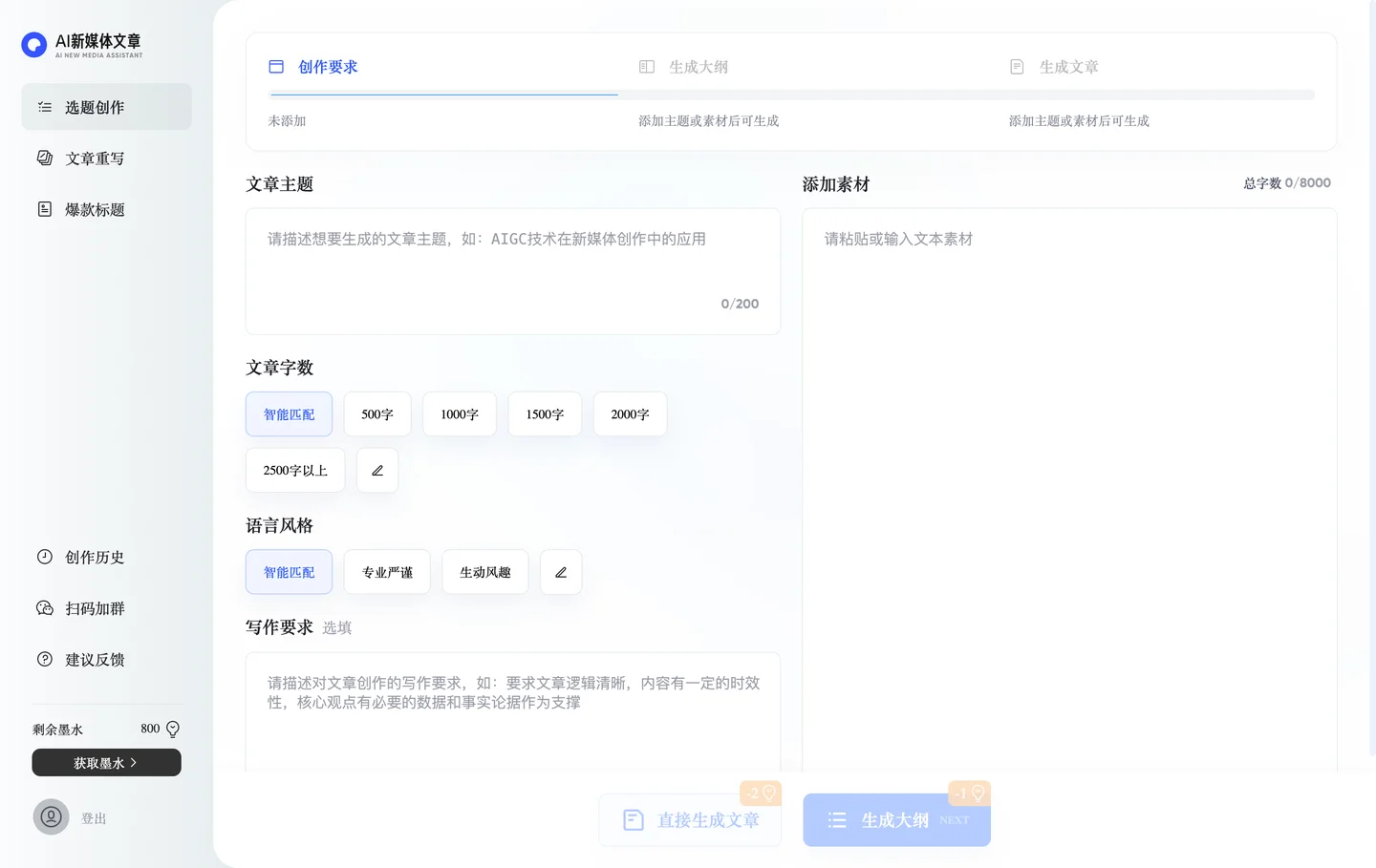 专为新媒体人打造,支持“选题创作”、“文章重写”、“爆款标题”等一系列的写作工具,基于实时资讯、热榜等,一键生成高质量原创文章,帮你快速抓住热点